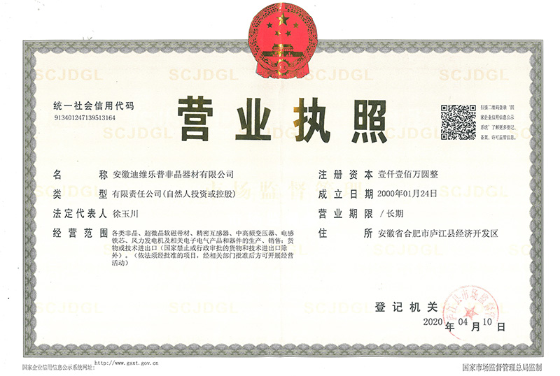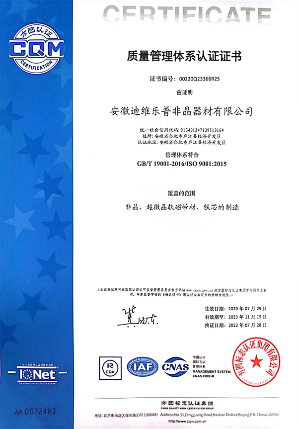 為響應國家標準化發(fā)展綱要,推動高質量發(fā)展,建設社會主義現(xiàn)代化國家。 安徽迪維樂普非晶器材有限公司、非晶合金電力互感器材料研究中心;為促進標 準化發(fā)展、提升標準化水平;實現(xiàn)企業(yè)有序發(fā)展、有規(guī)可循;產(chǎn)品質量有據(jù)可依、 方便客戶甄別選用,特制定本企業(yè)質量標準。